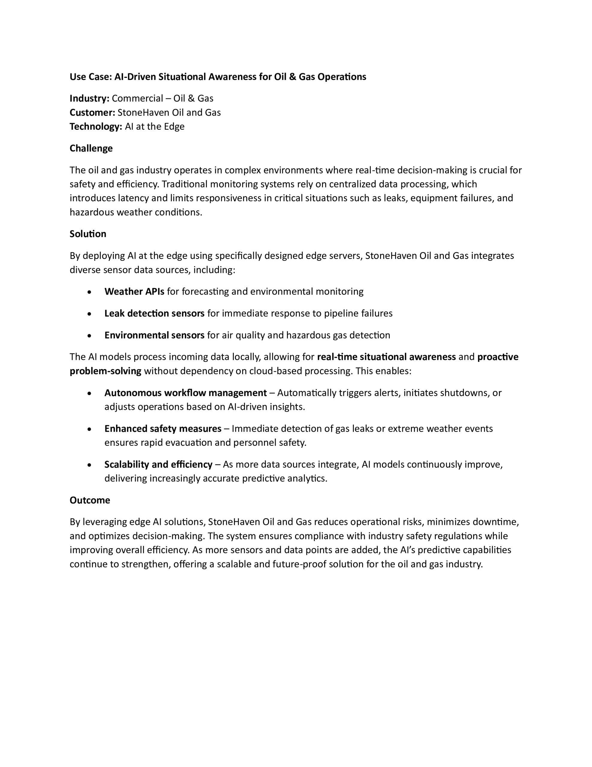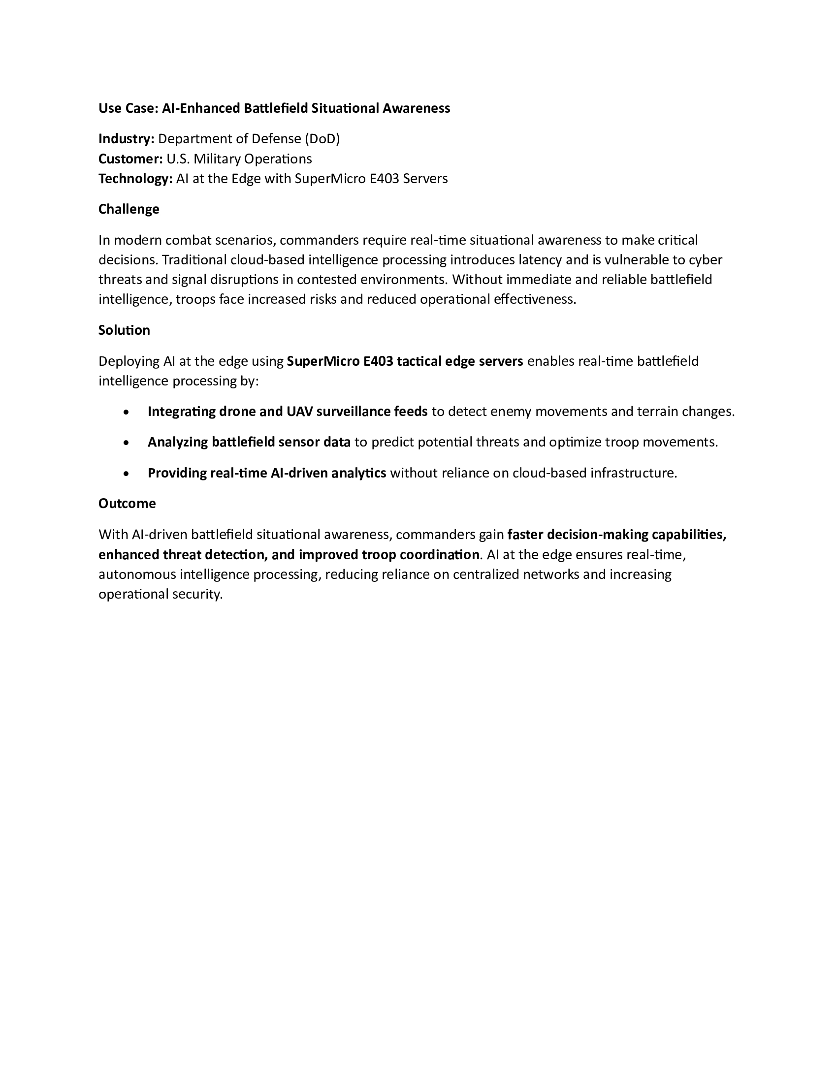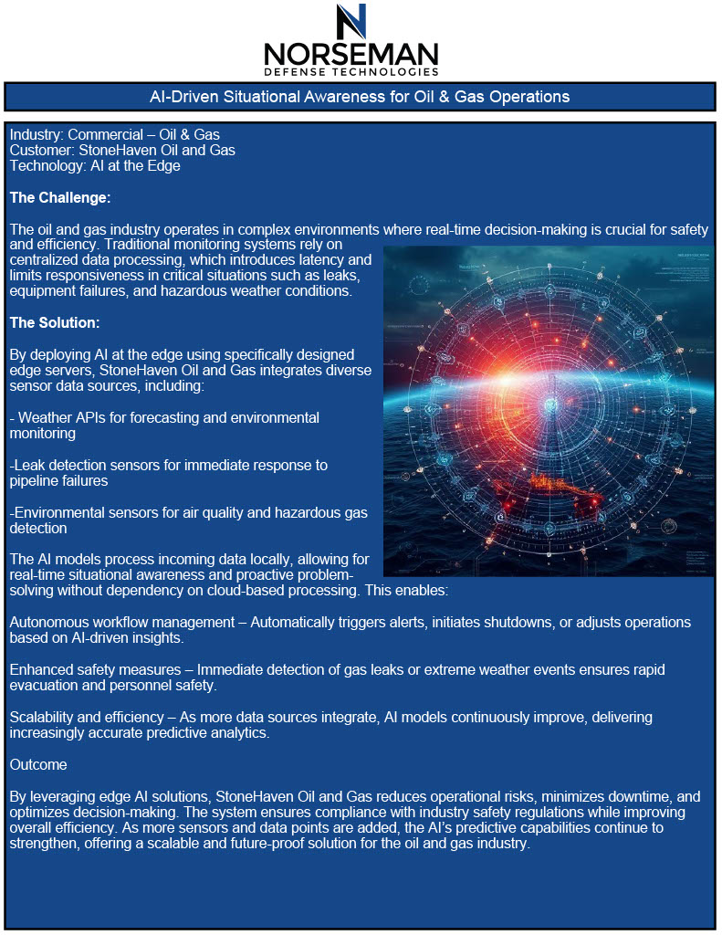 Use Cases AI-Driven Situational Awareness for Oil & Gas Operations Learn More AI-Enhanced Battlefield Situational Awareness Learn More AI-Powered Border Security & Surveillance Learn More Enhancing Federal Resilience with AI at the Edge Learn More AI-Powered Predictive Maintenance for Military Vehicles Learn More AI-Driven Situational Awareness for Oil & Gas Operations Learn More AI-Driven Emergency Response for Disaster Management Learn More AI-Enhanced Medical Imaging for Faster Diagnoses Learn More AI-Powered Predictive Diagnostics in Remote Clinics Learn More